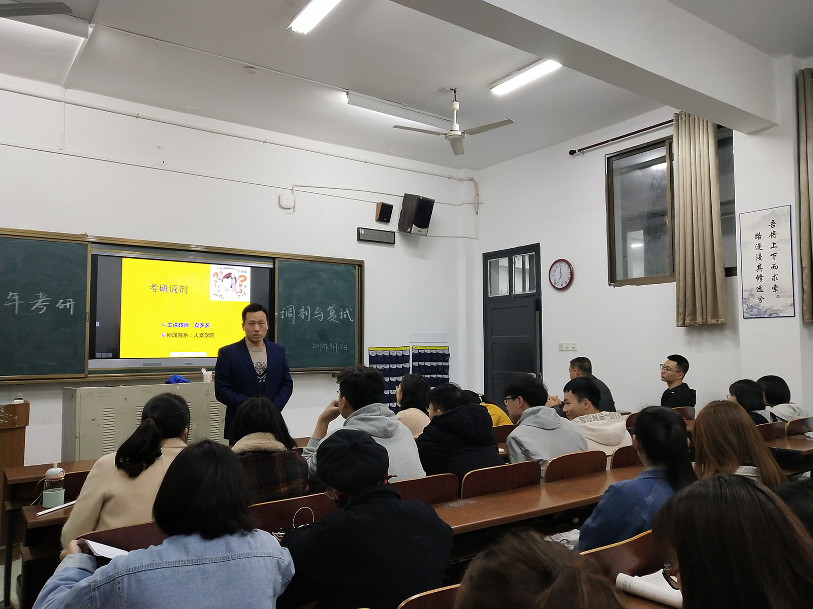 夏多多博士对考研调剂方面的知识做了系统的讲解,他对考研调剂的时间,面对调剂的态度问题,调剂流程、基本条件、注意事项,考研国家分区和报名注意事项进行了仔细的讲解。彭小球博士对考研复试方面的注意事项进行了讲解,强调了考研复试的重要性,提醒同学们密切关注所考公司的复试信息,对复试所考的内容进行了解,掌握有关复试的小技巧。最后彭小球博士送给在座的考研员工两句话:用细节说话、用实力说话。