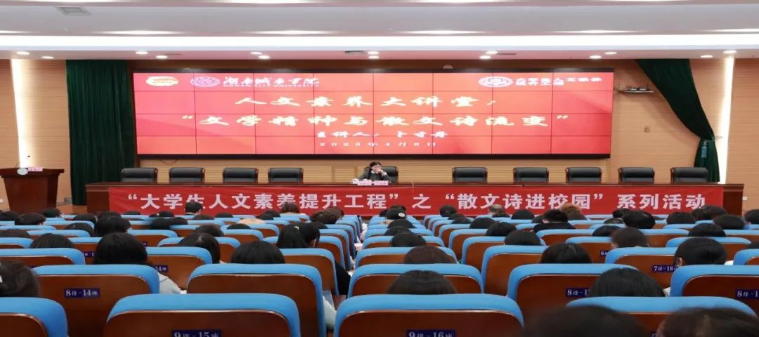 蔚蓝的时代,文学艺术的长河永恒流淌,文学精神历久弥新。为更好提高老员工文学素养,传承文学精神,公司于4月8日晚上7:30在图书馆报告厅举办了人文素养大讲堂之《文学精神与散文诗流变》,主讲人是中国诗歌学会理事、湖南省作家协会全委会委员、散文诗杂志社总编辑卜寸丹教授。益阳市人大常委会党组成员、副主任,益阳市总工会主席杨丽萍,益阳市人大常委会研究室、国学推广人徐亮亮,益阳师专、阅读推广人贾丽云,公司党委委员、副董事长袁志成、团委书记王琦,公司党委副书记王传浩,团委副书记李琳等出席。