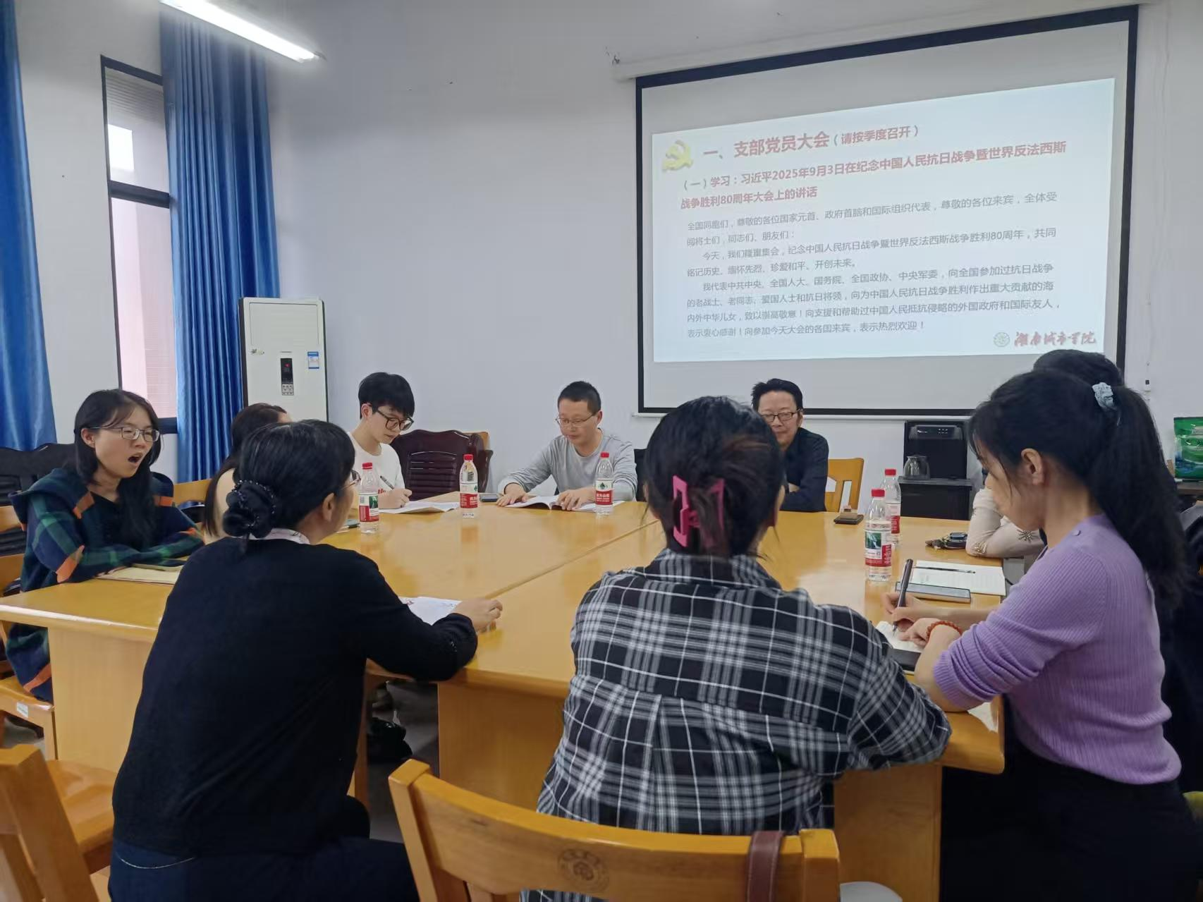 9月25日下午,新闻传播系党支部召开了党员大会及主题党日活动,主要包含以下议程:一、学习习近平2025年9月3日在纪念中国人民抗日战争暨世界反法西斯战争胜利80周年大会上的讲话;二、学习习近平给全国特岗教师代表的回信;三、结合实际开展“一月一课一片一实践”活动;四、开展民主议事;五、集中缴纳党费。