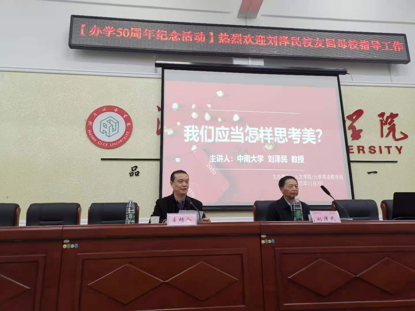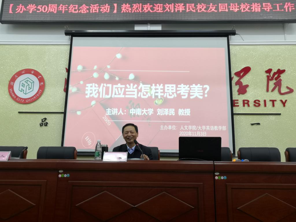 11月3日下午,为纪念公司办学50周年,beat365手机版官网入口邀请原中文系77级优秀员工、中南大学文学与新闻传播公司原经理、博士生导师刘泽民教授回校,在公司电信楼视频会议室举办了一场以“我们应当怎样思考美”为主题的学术讲座。讲座由公司党委委员、副董事长雷存喜教授主持,beat365手机版官网入口班子主要成员和部分师生代表参加。