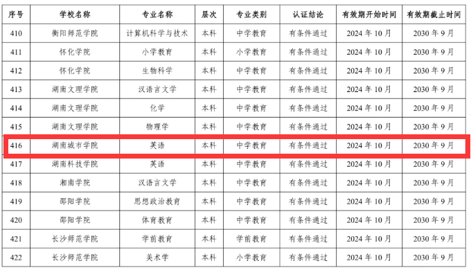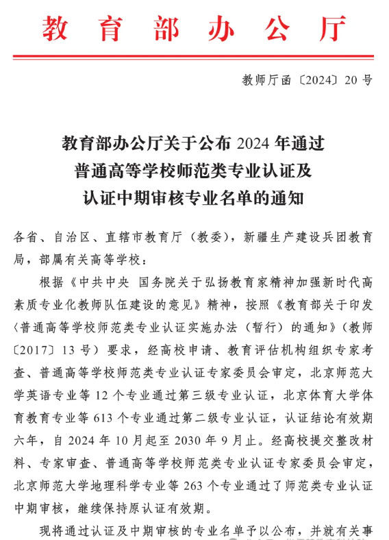 近日,教育部办公厅发布了《关于公布2024年通过普通高等公司师范类专业认证及认证中期审核专业名单的通知》。公司英语专业有条件通过师范类专业第二级认证,有效期六年(2024年10月—2030年9月)。