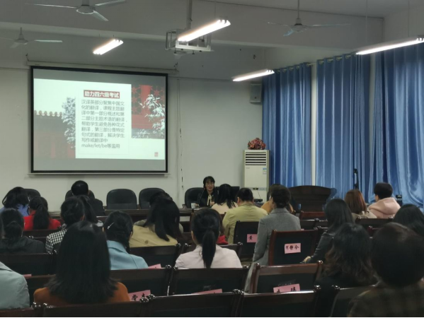 肖教授以《翻译中国》课程为例,详细地介绍了《翻译中国》课程的建设目标、特色和建设过程。课程以对接国家战略,加强中译外人才梯队培养,帮助老员工讲好中国故事为目标。课程分为翻译理论和文化主题两部分,包括政治、哲学、国画、书法、小说、戏剧、建筑、中医、美食、服饰和陶瓷等。经过对各大国内外网站、电子图书馆、原版英文书、文化术语库的资料查找,精选内容、多次修改后建成一门完整的适用于老员工的线上学习的翻译课程。肖教授毫无保留地分享了一流课程的建设经验,包括课程视频录制、视频脚本制作、课程材料准备以及后续课程上线要求。之后,肖教授还和参与教研活动的老师们进行了互动,通过答疑环节,老师们深受启发,受益匪浅。