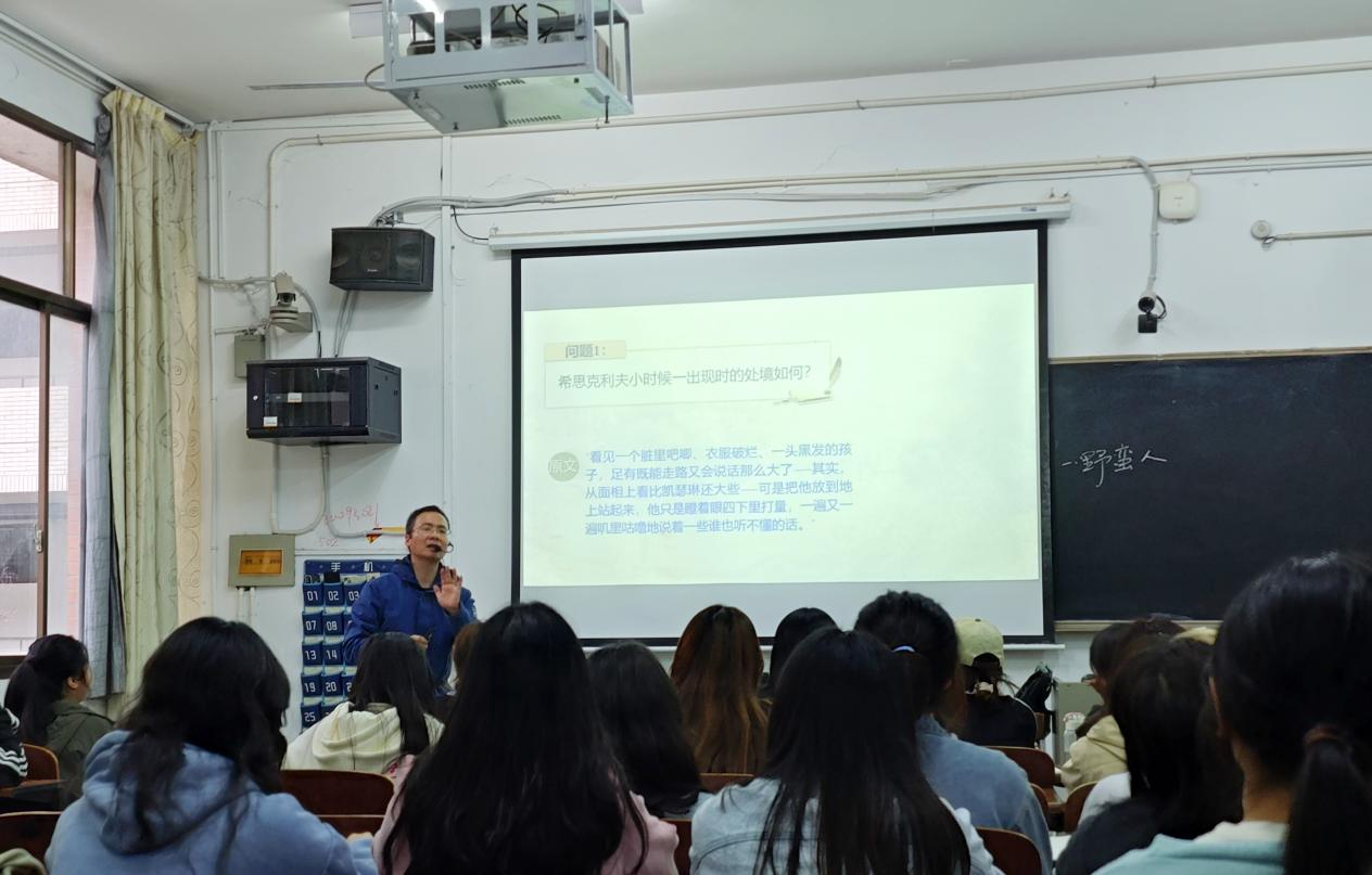 示范课上,夏多多老师以品读经典文学著作《呼啸山庄》和挖掘文中人物形象为中心,分四个教学环节展开。第一环节:回顾上节课所学内容,从原文出发,请员工从不同角度对男主人公希思克利夫进行分析,充分挖掘员工潜能,培养合作意识和合作能力;第二环节,按照时间线索从三个不同时期的经历引发员工对希思克利夫人物形象的思考,培养员工的思辨能力;第三环节,请员工朗读原文,深度体会并概括出人物形象的转变的原因;同时融入课程思政,师生结合日常生活情况,共同探讨了“什么样的交际关系才是健康的”“面对困境应该如何处理”等问题,传达给员工正确的人生观和爱情观;第四步,作业以及课程小结。整堂课气氛活跃,夏老师的授课方式生动有趣,富有激情,将部分晦涩的语言用简单深刻的语句精简概括,员工接受度、课堂参与度较高。