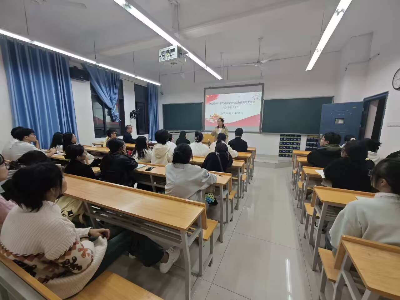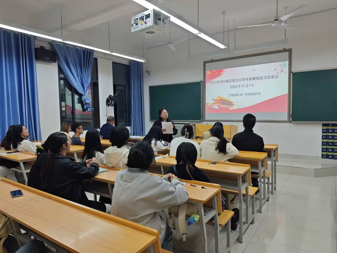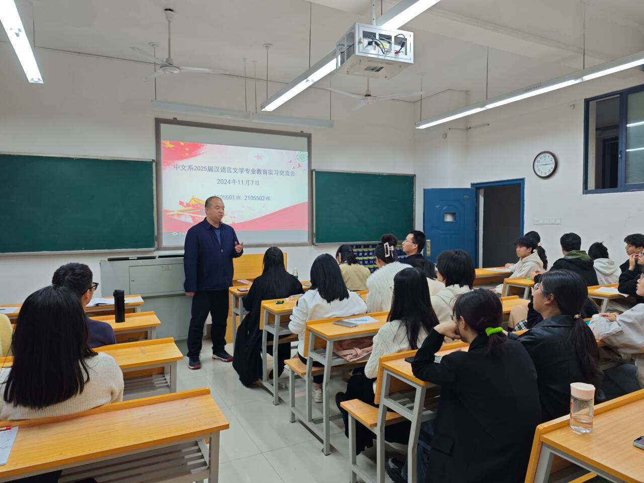 “秋将归去冬又至,寒色不遮万山翠”。2024年11月7日晚上,中文系在管理楼303室举行了2025届汉语言文学专业教育实习交流会。曾娟、夏多多、王林飞、何娟、贾红、燕妮等6位老师与2021级35名实习生参加会议。