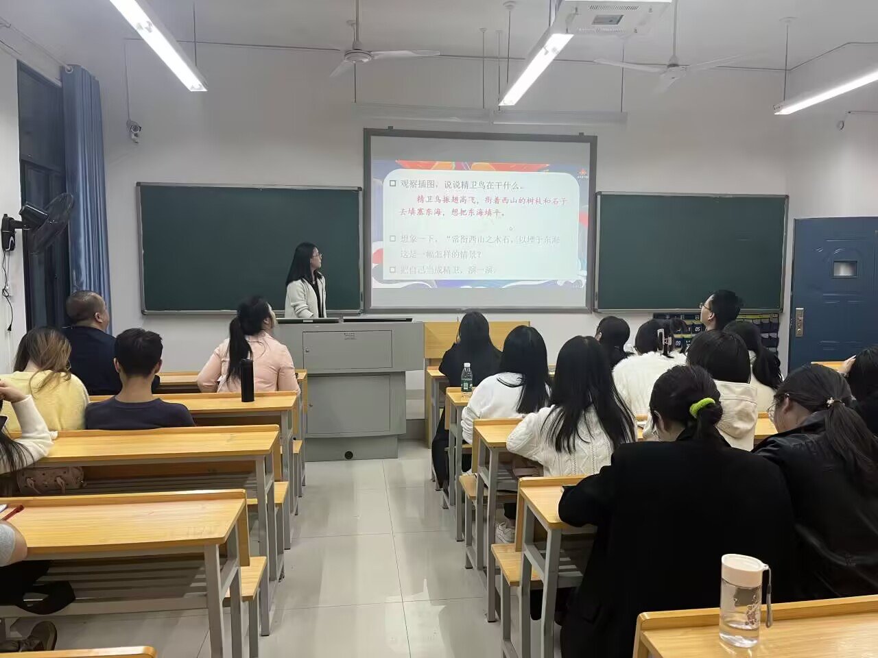 接着,四位实习生进行授课汇报。2105502班李朝以七年级语文《行军九日思长安故园》和《夜上受降城闻笛》、2105502班康建新以七年级语文课外古诗《秋词(其一)》、2105501班何伶俐以五年级语文《太阳》、2105501班廖珂荧以四年级语文《精卫填海》为内容,分别展示了4个精彩的教学片段。
