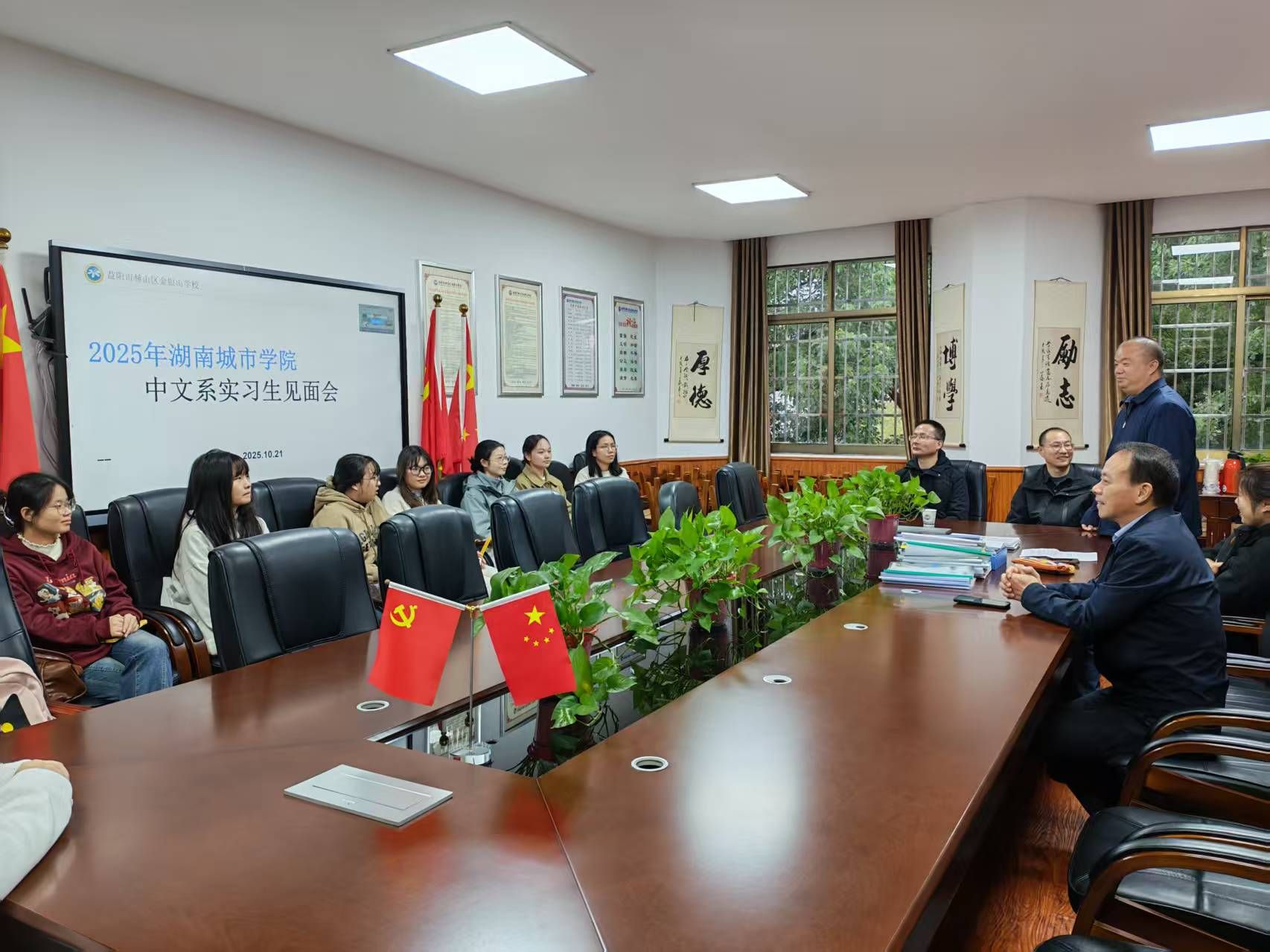 羊舞岭头栽桃李,金银山脚育栋梁。2025年10月21日上午10时,公司党委书记彭海华带队前往金银山公司参加2026届汉语言文学专业集中教育实习见面会,中文系夏多多、闻滨、陈思伶、王林飞等老师与汉语言文学专业2205501班17名实习生参加活动。见面会开始前,彭海华书记与参加实习的师生进行恳谈。