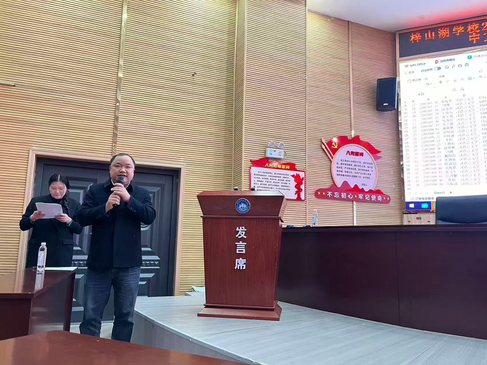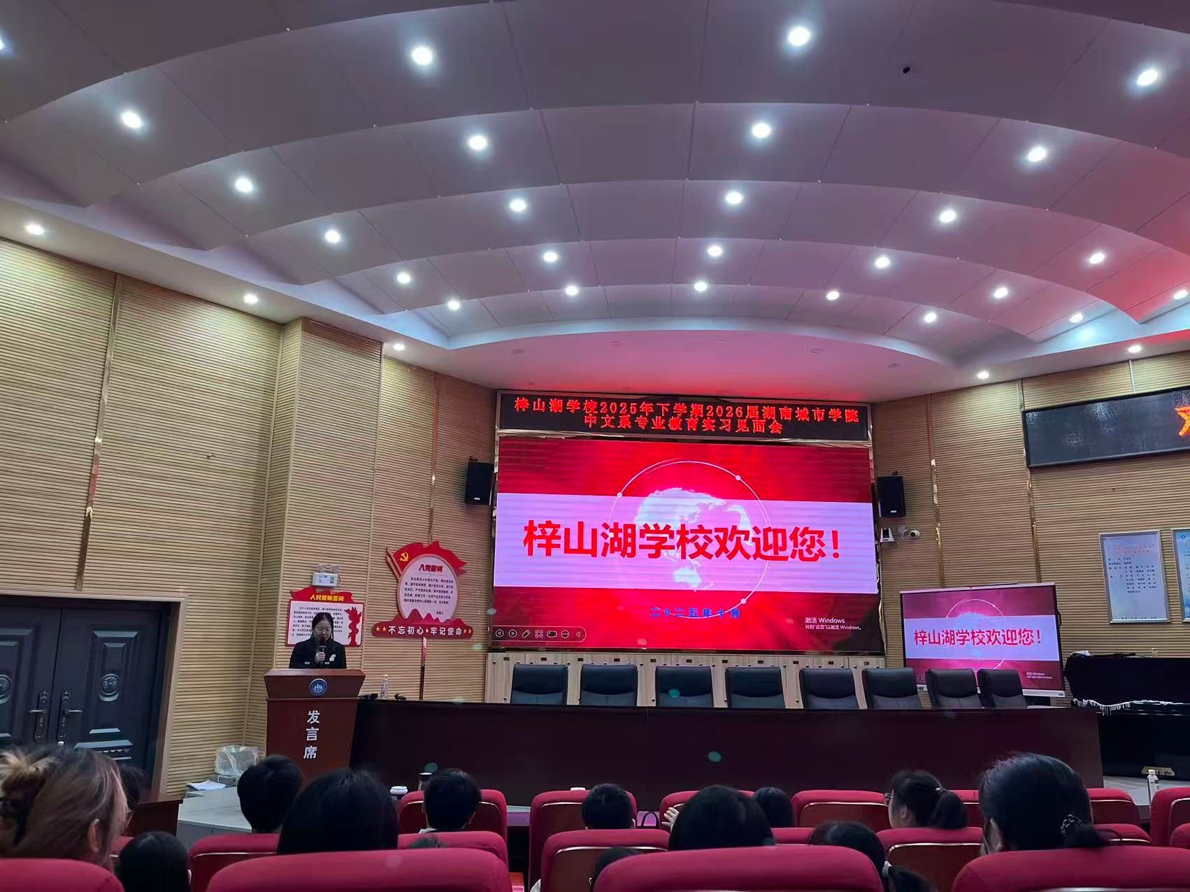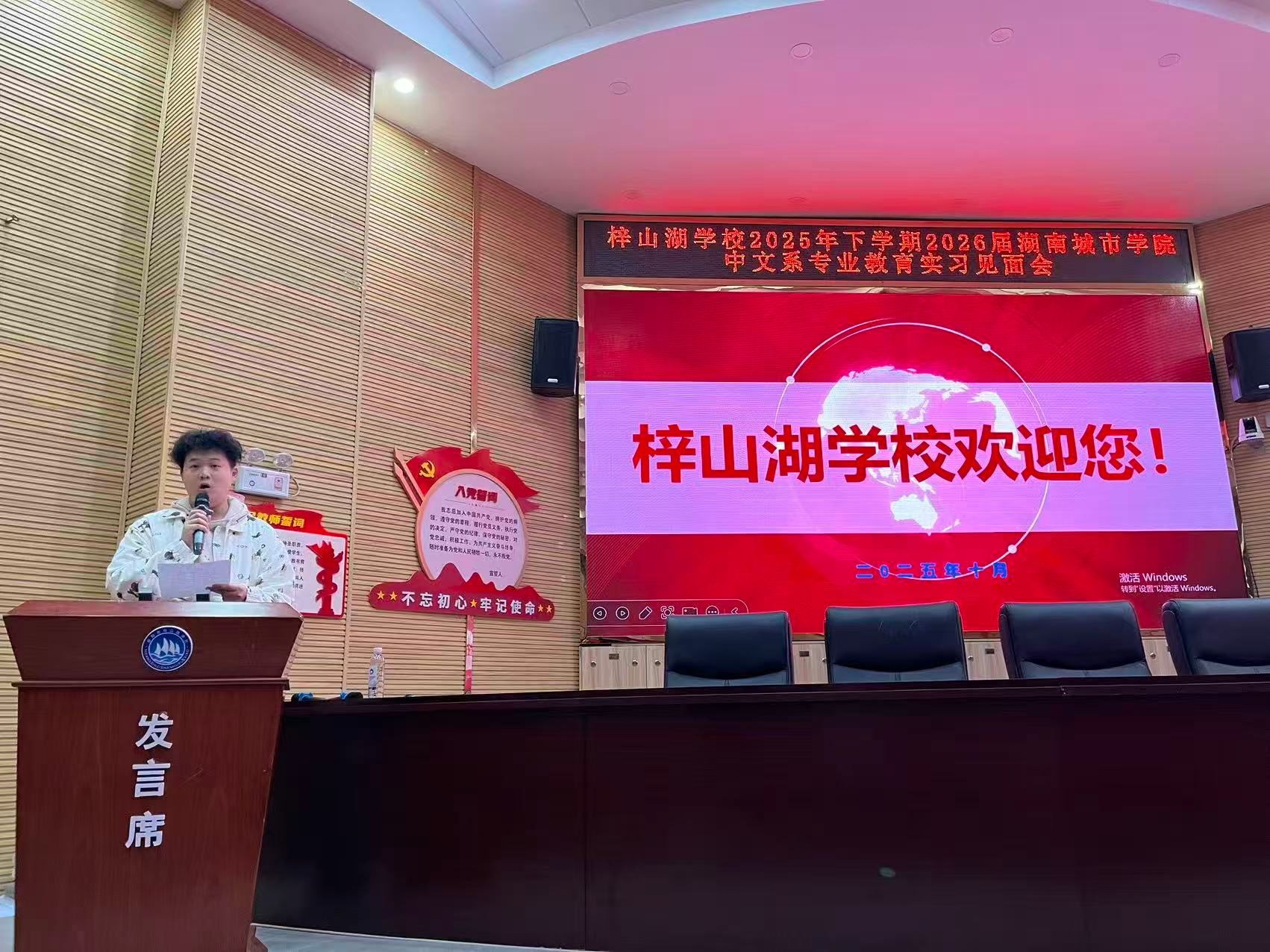 中文系党支部书记、中文系副主任贾红博士发言,对梓山湖公司各位领导、老师们搭建从理论到实践的实习平台表达由衷感谢,恳请各位指导老师不吝赐教、严格要求实习生。同时要求参加实习的同学们珍惜此次实习机会,做到眼勤、手勤、心勤,以学徒的姿态观察指导老师如何驾驭课堂;积极主动做事、不怕吃苦;用心思考,从执行者转变为研究者,以常怀温暖之心点亮员工,也希望同学们在实习后能收获站稳讲台的底气、读懂员工的眼光和认同身份的初心,将期待稳稳落地,化作实实在在的成长。