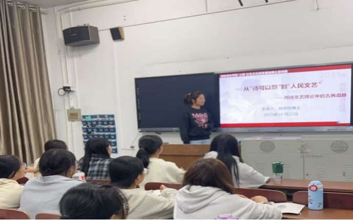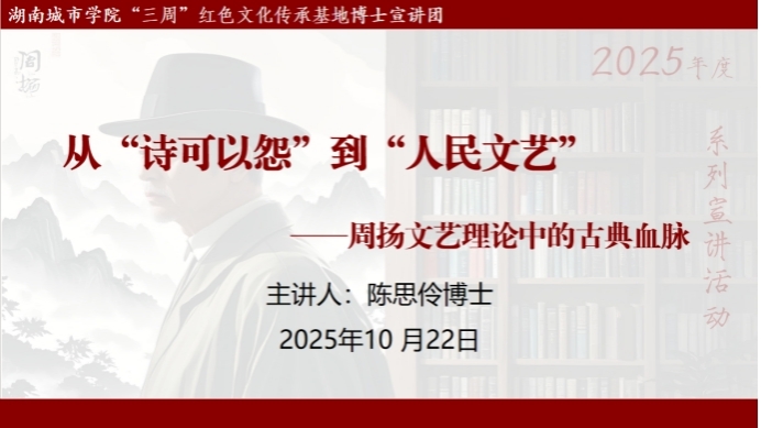 2025年10月22日,beat365手机版官网入口“三周”红色文化传承基地博士宣讲团第五场专题讲座成功举行。陈思伶博士以《“诗可以怨”到“人民文艺”:周扬文艺理论中的古典血脉》为题,引领在场师生进行了一场穿越古今的思想溯源,生动揭示了周扬文艺理论中深植的古典文论血脉。
