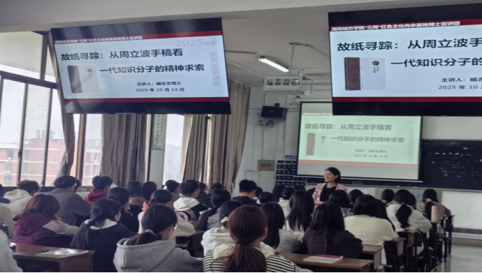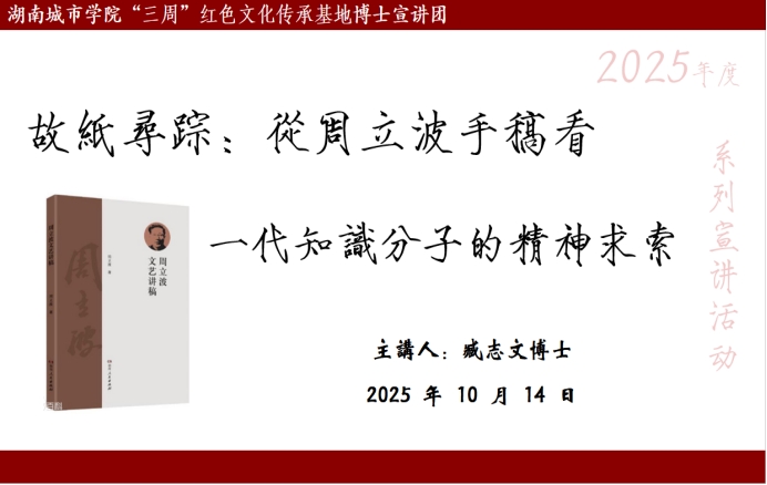 2025年10月14日,beat365手机版官网入口“三周”红色文化传承基地博士宣讲团系列讲座正式拉开帷幕。首场讲座由臧志文博士主讲。臧志文老师以“从周立波手稿看一代知识分子的精神求索”为题,为在场师生带来一场深刻的学术洗礼。