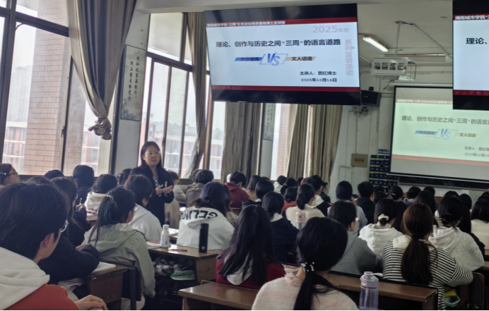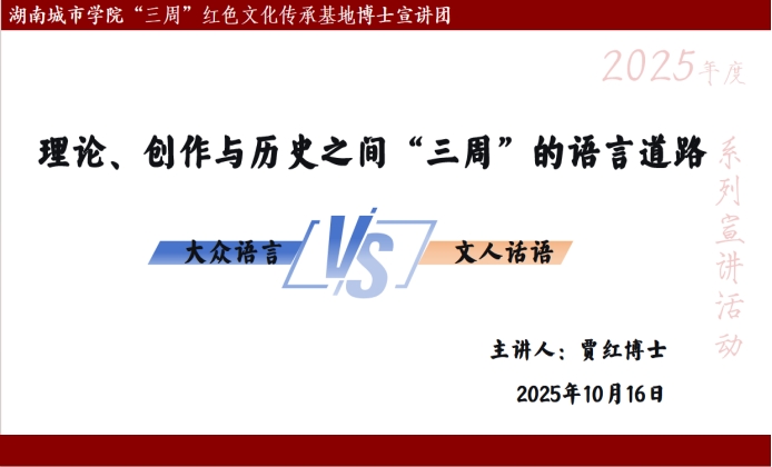 2025年10月16日,beat365手机版官网入口“三周”红色文化传承基地博士宣讲团举办题为《理论、创作与历史之间 “三周”的语言道路》的专题讲座。本次讲座由贾红博士主讲,深入探讨了周扬、周立波、周谷城三位大家在20世纪中国语言变革中的独特贡献与共同追求。