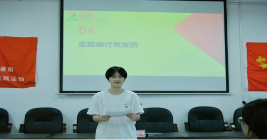 在庄严的氛围中,感光支教团志愿者代表文可欣同学发表了演讲,她表示:“作为感光支教团的一员,我们深感责任重大,使命光荣。我们将以满腔的热情和坚定的信念,将文化的种子播撒在乡村的每一个角落,珍惜这次难得的实践机会,不断学习、不断成长,为乡村振兴贡献我们的青春力量。” 随后,为进一步增强志愿者的信念感与使命感,全体志愿者在领誓人蒋凯玲的带领下进行了庄严的宣誓。