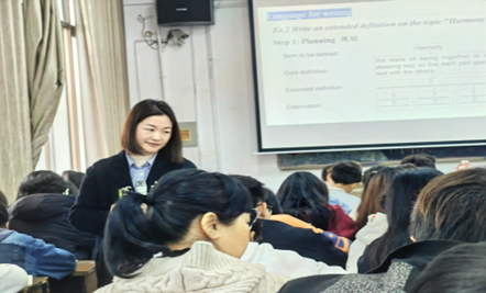 隆娟老师的课堂以理解中国文化和传统为中心,分四个教学环节展开。第一环节,回顾“文学圈”活动,了解“文学圈”内的不同角色如何从不同角度对文本进行分析,充分挖掘员工潜能,培养合作意识和合作能力;第二环节,引出“文学圈”内的任务研究者如何研究撰写一篇与“和谐”相关的四、六级作文,培养员工英语应用能力和思辨能力;第三环节,介绍此类作文的写作技巧以及写作语言。从宏观到微观,从结构、内容到语言组织,由浅入深,逐步推进;第四步,作业以及课程小结。在讲授写作技巧之前,隆老师从员工提交到云班课平台的作业中进行抽样并点评,从而引出如何写好一篇与定义相关并且如何拓展定义的作文。方法主要包括写作目标、写作技巧以及写作语言。隆老师通过讲解与员工练习实践相结合的方法,启发员工挖掘出书写此类作文在拓展定义时的方法和技巧包括举例、对比、分类,因果等。在写作语言上,主要介绍了同义词、反义词。最后,隆老师鼓励并要求员工运用本课所学的写作技巧和写作语言,重新规划、起草并修改云班课中自己的作业。